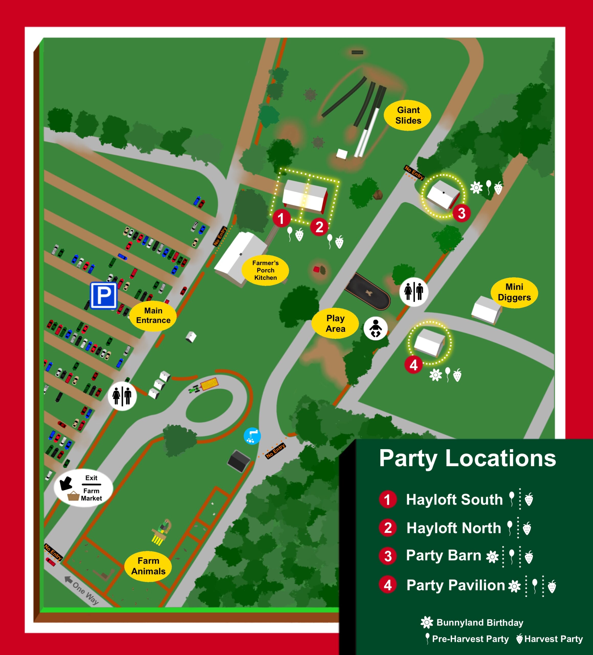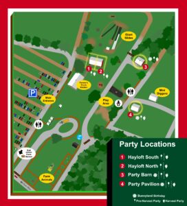 Party Barn (Red building located to the right of our Giant Slides, at the top of the hill in the Farm Park)