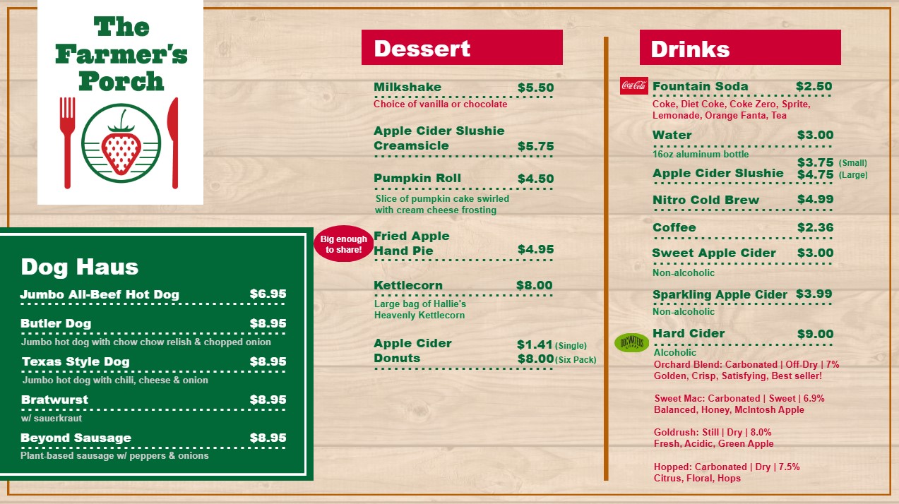 The Farmer’s Porch, located in our Farm Park, has an array of small bites, sandwiches, pizzas and more! Chef Jay has created dishes for everyone in the family alongside a rotation of seasonal offerings that take advantage of fresh picked fruits and vegetables.